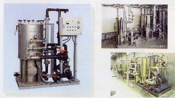 システムは、共通ベース上に左記のろ過装置・源泉化装置・循環ポンプ・熱交換器・制御盤等をあらかじめ組み込んである架台セット型と、ろ過装置・源泉化装置・その他機器を現地にて組み上げる方法とがあります。